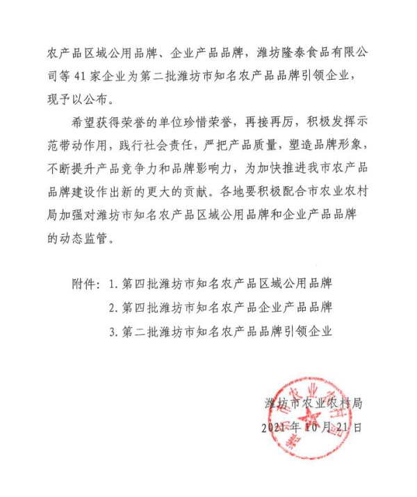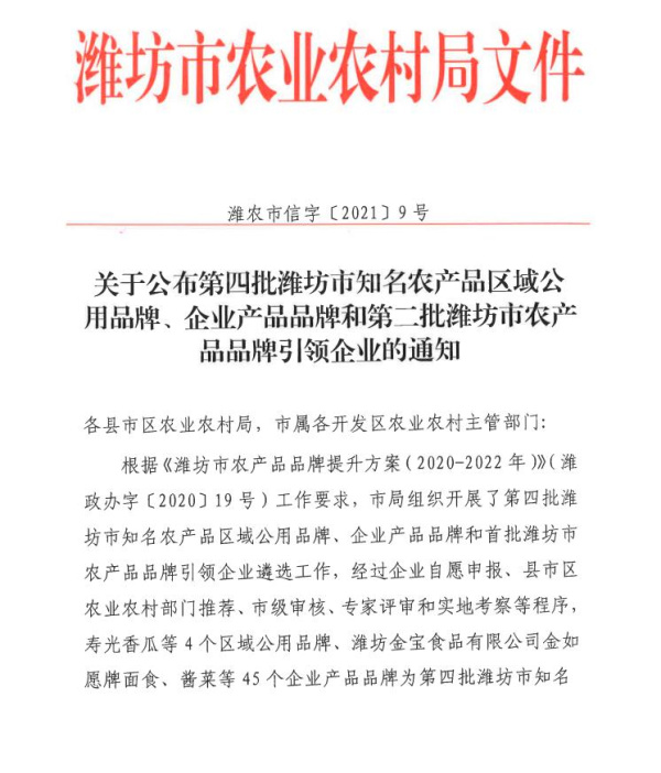 山東振榮食品有限公司榮獲第四批濰坊市知名農(nóng)產(chǎn)品企業(yè)產(chǎn)品品牌